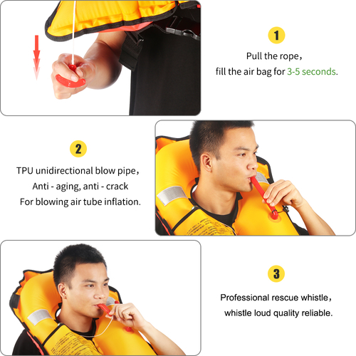 Manually pull the cord to inflate the device, release the carbon dioxide cylinder at high pressure and fill the air bag for 3-5 seconds.